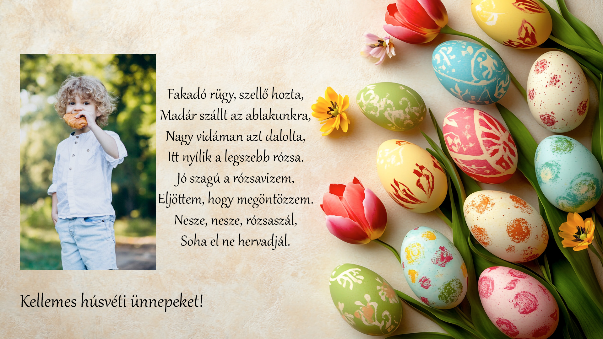 Lepd meg a szeretteidet egy különleges húsvéti köszöntővel! Ez a gyönyörű üdvözlőlap tökéletes ajándék húsvét alkalmából. Személyre szabható üzenettel és elegáns dizájnnal készül, hogy emlékezetessé tedd ezt a különleges ünnepet.